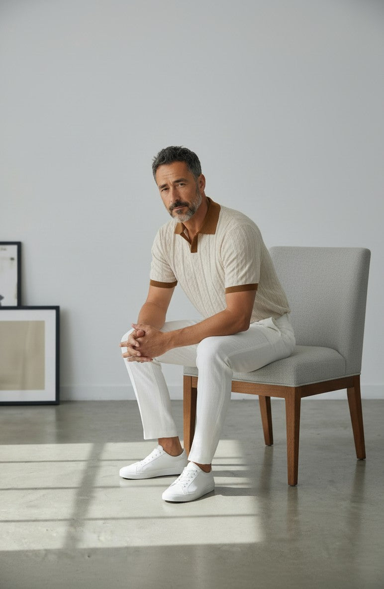 A refined blend of texture and contrast, the Capri Polo features a soft knit body with subtle vertical detailing that enhances depth and structure. The ivory base is paired with a rich brown collar and sleeve trim, creating a warm, balanced look. Tailored for a clean silhouette, it delivers both comfort and elevated style.